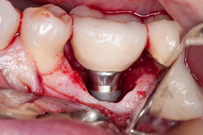Surgical treatment is generally limited to implants placed on non-aesthetic areas. The surgical flap technique helps complete debridement and decontamination of the implant affected by peri-implantitis. Surgical treatment is performed using autogenous bone grafts + membranes or membranes alone or even autogenous bone grafts alone.