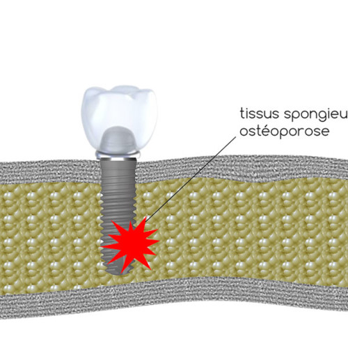 Osteoporosis affects nearly 30% of postmenopausal women but also men. Osteoporosis also has consequences on teeth and teeth, oral health in general and dental implants. One type of dental implant that overcomes this problem, is the basal implant. Its physiological relationship with the bone tissue is mechanical. The retention of the basal dental implant in the cortical area of the bone makes it possible to treat patients suffering from ‘osteoporosis except in certain special cases such as bisphosphonate treatment.
